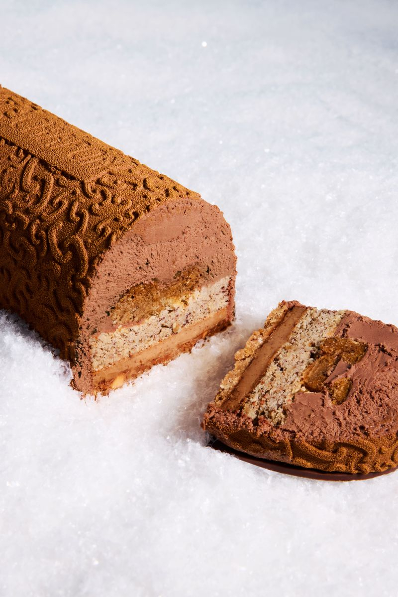 - Bûche Chocolatée : Un hommage au cacao sous toutes ses formes : cœur de crème brûlée à la vanille, biscuit moelleux au chocolat et mousse intense relevée d’un praliné feuillantine croustillant. Prix : individuelle 6,80 € (à partir du 1er décembre) / 4 pers. 28 € / 6 pers. 38 € (à partir du 10 décembre)
