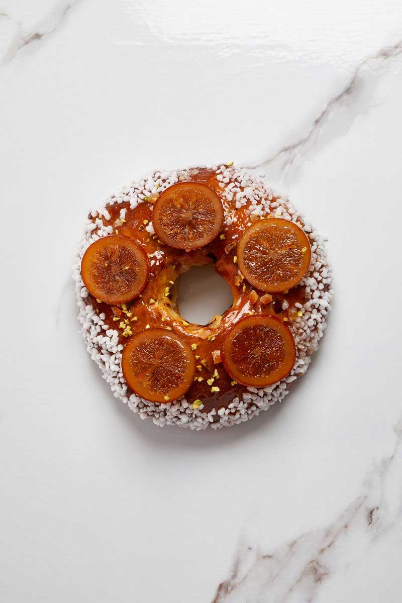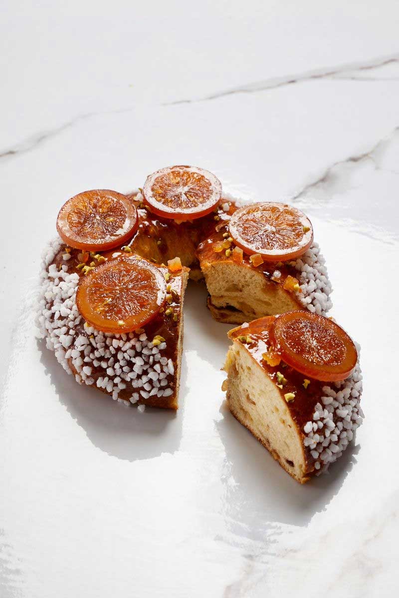 - La brioche des rois : une brioche joufflue parfumée à la fleur d’oranger, garnie de fruits confits et de gros grains de sucre. Prix : individuelle 5 € / 4 pers. 20 € / 6 pers. 29€ (à partir du 2 janvier)