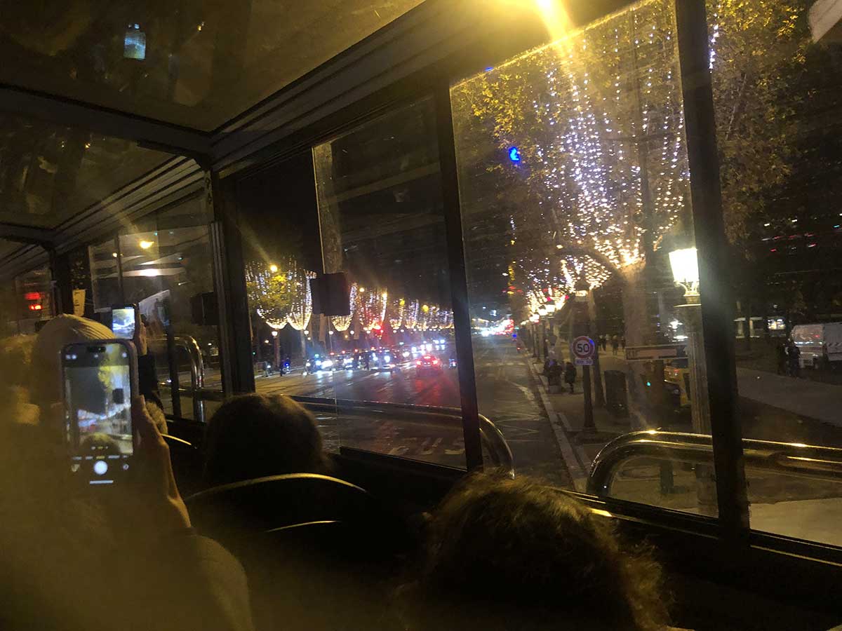 Nous montons à l’étage, évidemment. En haut, il y a déjà une famille de Japonais emmitouflés comme s’ils partaient au pôle Nord, un couple qui se dispute en italien (« Marco, je t’avais dit de prendre le bonnet ! »), et nous avec bonnets de Père Noël lumineux acheté 12 € sur les Champs on clignote et on assume !. Le bus démarre. Le commentaire audio se lance en 8 langues. C’est magnifique. Vraiment. Les lumières dorées, la foule, les sapins… tellement charmant de jouer les touristes dans sa propre ville au milieu des anonymes (les vrais touristes, eux) Et si le vent à décorner les rennes du Père Noël s’engouffre dans l’habitacle dès qu’on ouvre les fenêtres pour immortaliser avec nos téléphones ces instants magiques, nos bonnets restent finalement vissés sur nos têtes et le plaid mis à notre disposition s’avère efficace.