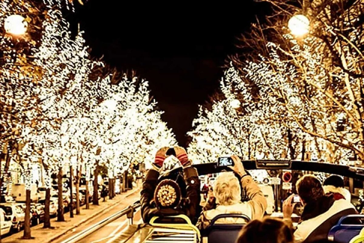 Nous montons à l’étage, évidemment. En haut, il y a déjà une famille de Japonais emmitouflés comme s’ils partaient au pôle Nord, un couple qui se dispute en italien (« Marco, je t’avais dit de prendre le bonnet ! »), et nous avec bonnets de Père Noël lumineux acheté 12 € sur les Champs on clignote et on assume !. Le bus démarre. Le commentaire audio se lance en 8 langues. C’est magnifique. Vraiment. Les lumières dorées, la foule, les sapins… tellement charmant de jouer les touristes dans sa propre ville au milieu des anonymes (les vrais touristes, eux) Et si le vent à décorner les rennes du Père Noël s’engouffre dans l’habitacle dès qu’on ouvre les fenêtres pour immortaliser avec nos téléphones ces instants magiques, nos bonnets restent finalement vissés sur nos têtes et le plaid mis à notre disposition s’avère efficace.